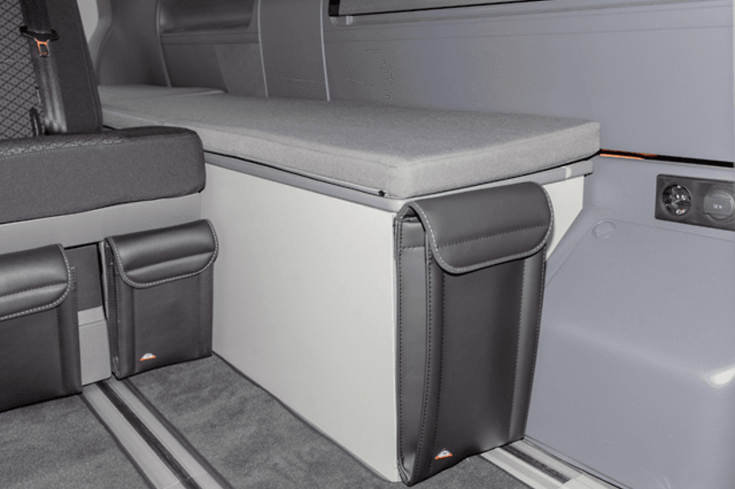 - La grande poche est identique à celle du logement de la douche à main pour le California Ocean/Coast VW. Elle est capitonnée avec à l’intérieur un système d’attache de ceinture, pour attacher un sac poubelle usuel de 20 l– pratique pour mettre les slips et maillots de bain humides, les croquettes pour chiens mais aussi pour les ordures, etc.