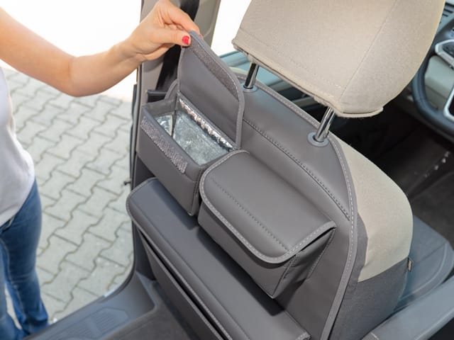 Dans les véhicules équipés de sièges pivotants, il est judicieux de monter l’UTILITY avec MULTIBOX Maxi au dos du siège conducteur : un siège conducteur pivotant est facile à tourner, car le volant dispose d’un espace entre les rangées de poches. L’UTILITY peut aussi être monté sur le siège droit ou gauche selon vos besoins.