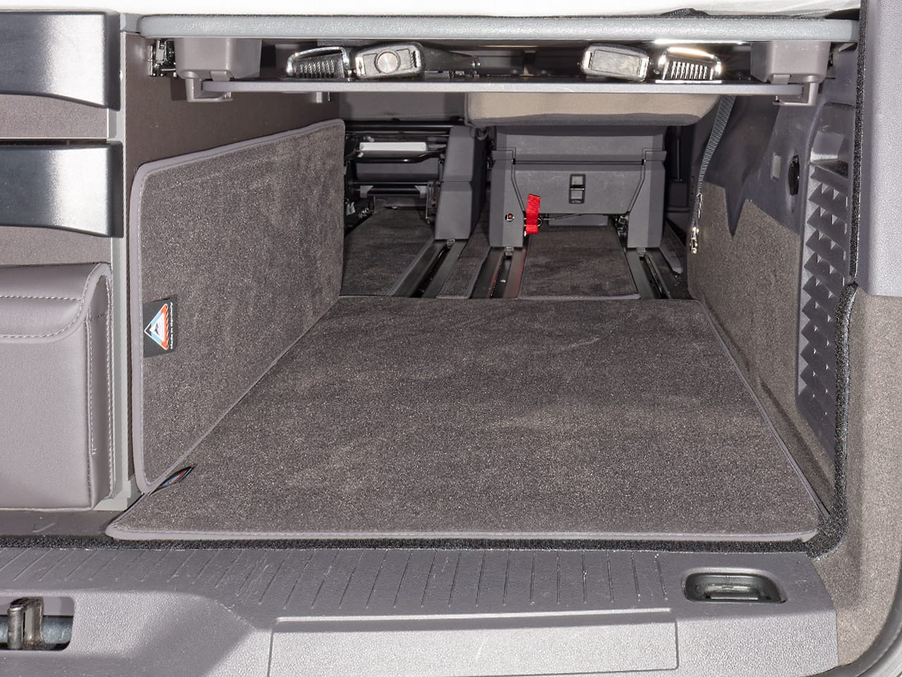 Le tapis de protection pour coffre du VW T7 California Beach Camper est doté d’une fixation à une bande auto-agrippante à l’avant pour une intégration parfaite au tapis de sol en velours de l’habitacle (réf. 100 708 653).