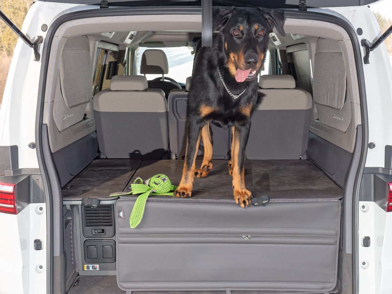 Design VW T7 d’origine Raven (noir). Intégration parfaite dans l’espace chargement, comme un équipement de série premium.