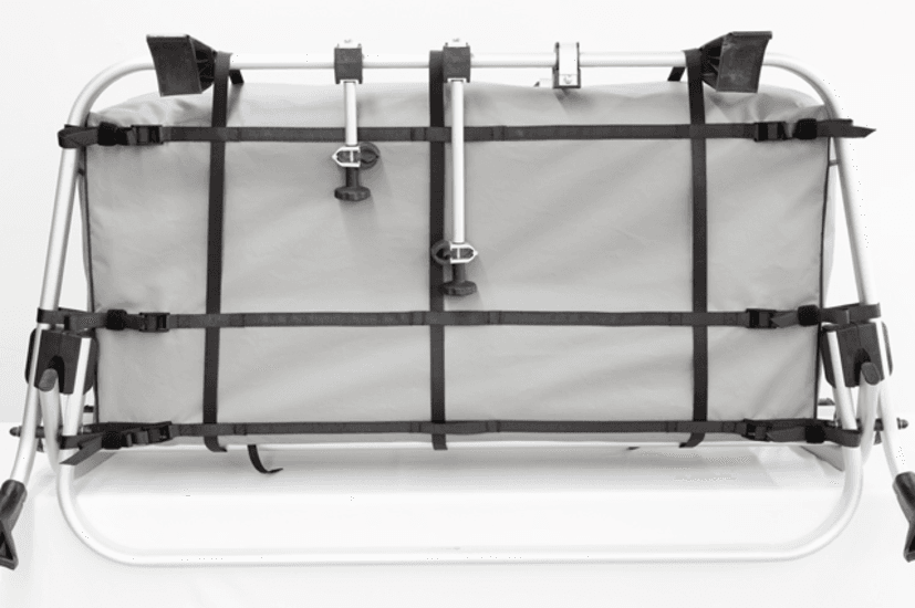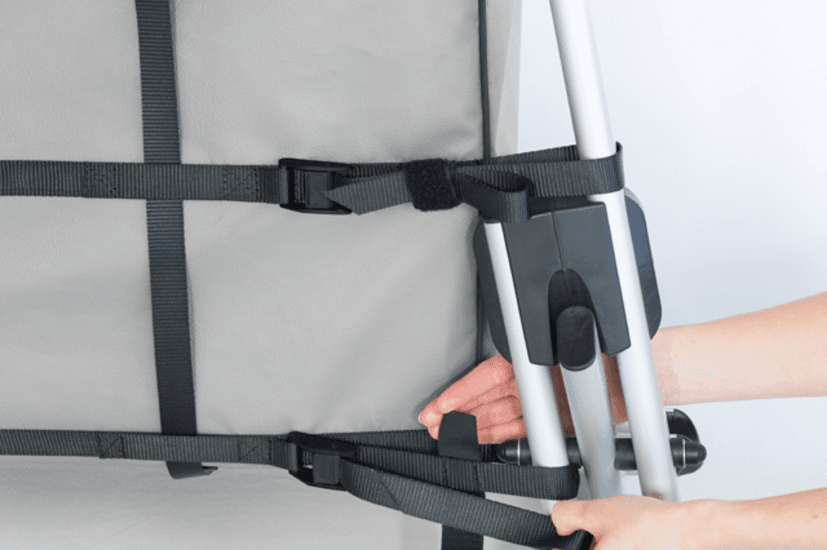 - Fixation très robuste par 3 sangles de polyester avec boucles d’arrimage en aluminium et des cames à griffes auto-bloquantes, et des fixation latérale particulièrement solides avec six points d‘attache.