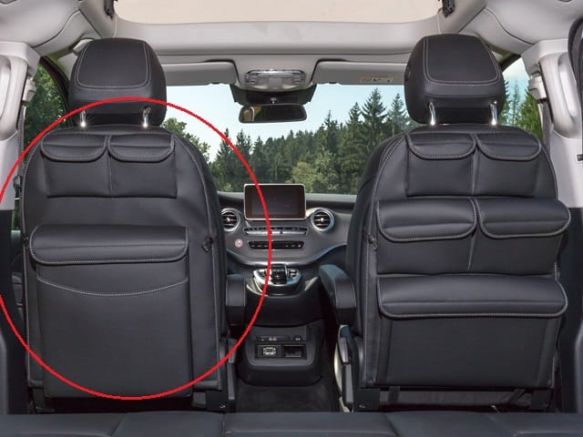 Les poches Utilities d’origine font gagner beaucoup de place en répartissant intelligemment les espaces, ce qui crée une atmosphère raffinée et agréable. La fixation au dossier du siège est simple : en haut la poche est maintenue par l’appuie-tête, en bas des crochets en plastique sont sur l’embase du siège. La fixation latérale est assurée par des lanière passées autour des accoudoirs.