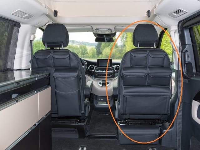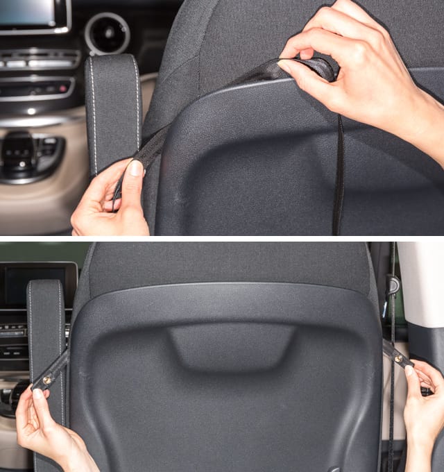 Le dos de siège 5 poches du siège passager avant offre un grand espace de rangement. Les poches Utilities s’adaptent également au siège conducteur du Classe V et Horizon de Mercedes-Benz.