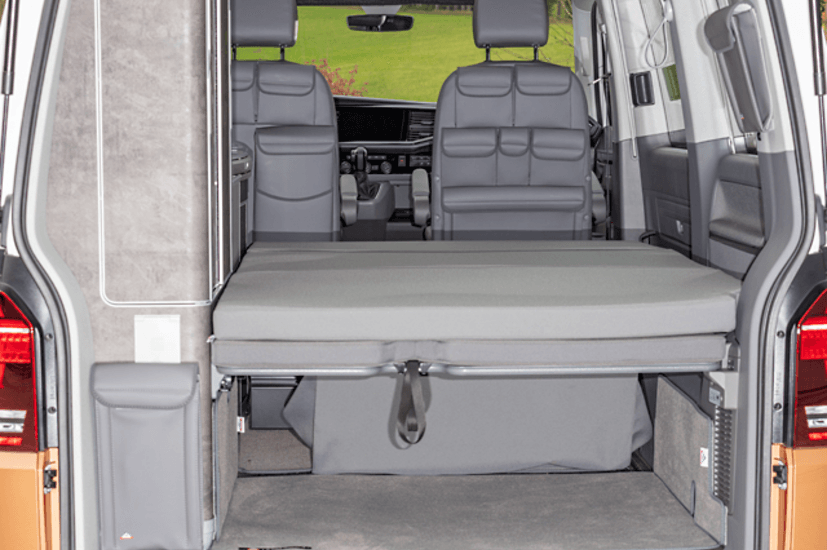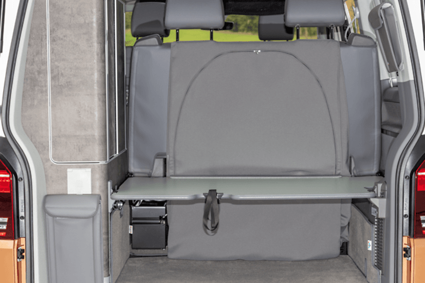 - Le sac à dos de banquette FLEXBAG offre un rangement d’environ 266 l lorsque la banquette 2 places du California VW est avancée au maximum : beaucoup de place bien protégée pour la literie et/ou les bagages.
