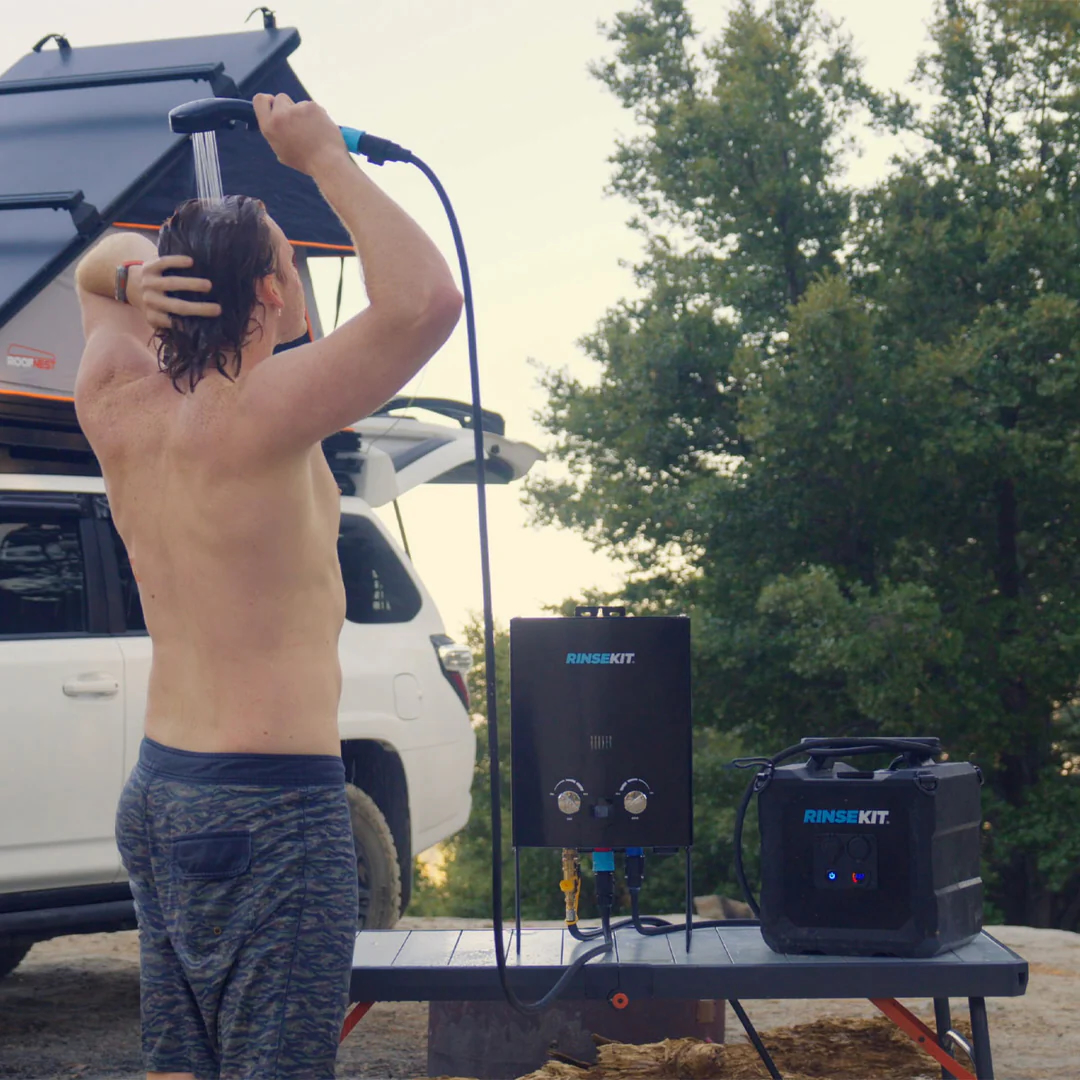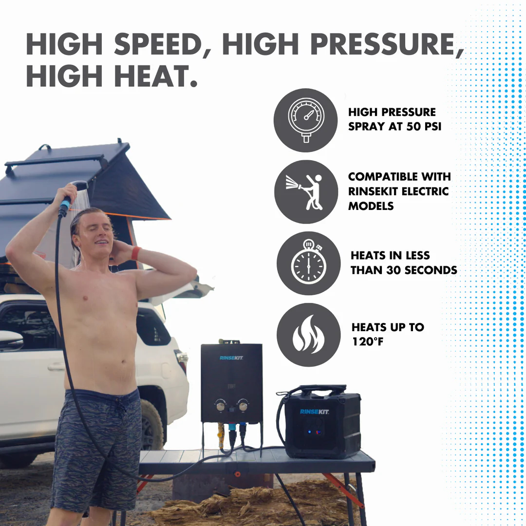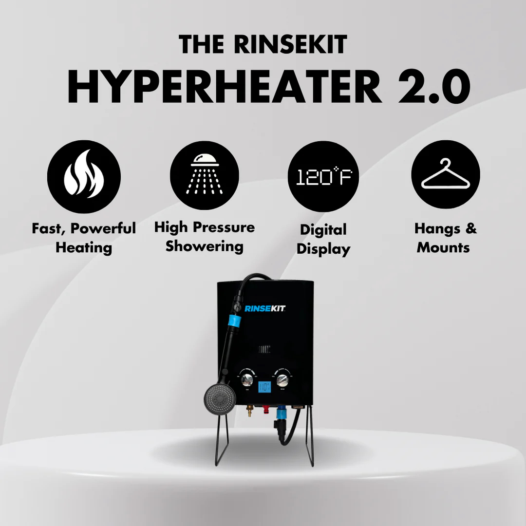 Le Hyper Heater 2.0 transforme ton Rinsekit en douche chaude instantanée. Propane autonome, 49°C en 30 sec, montable sur van. Compatible Pro, Cube, Rack. Confort ultime + autonomie totale ! 🔥🚿