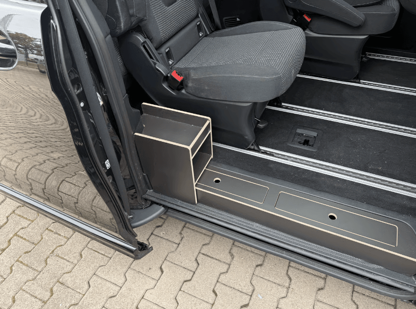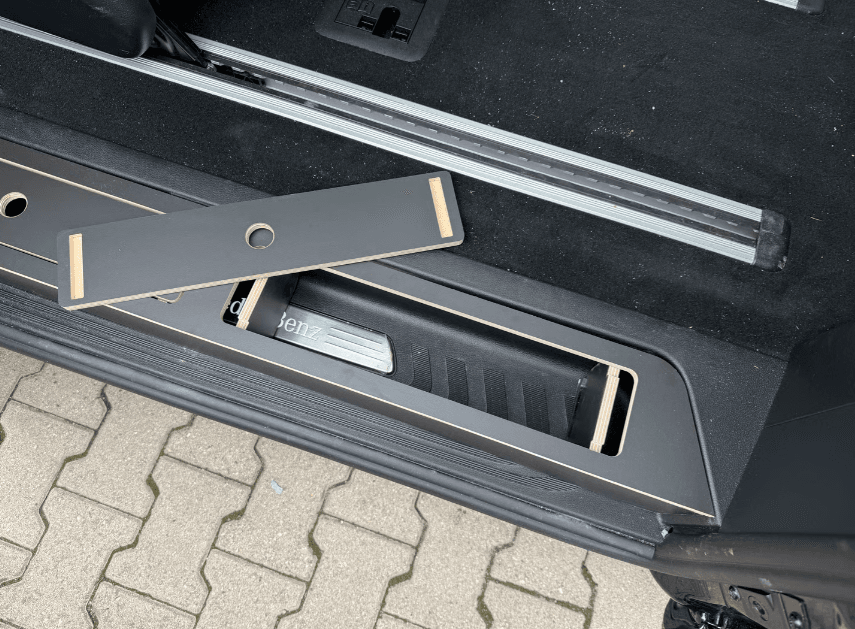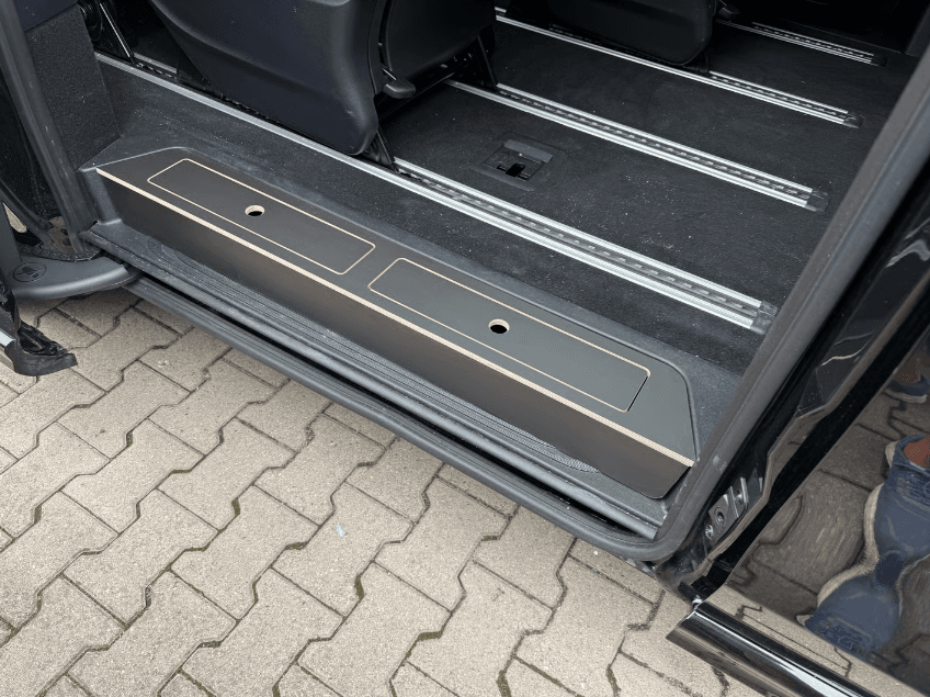 Cet insert transforme la marche d’entrée de votre Mercedes Marco Polo ou V-Klasse en espace de rangement intelligent. Fabriqué en multiplex bouleau massif par VAN-ZUBEHÖR, il agrandit la surface de la marche tout en offrant un rangement supplémentaire avec 2 couvercles.