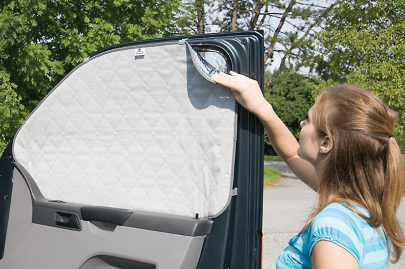 - Tout d’abord le pare-brise. La fixation de l’isolant du pare-brise est aux dimensions exactes de l’encadrement dans lequel il s’encastre. Une fermeture velcro autocollante au rétroviseur obturant le tout.