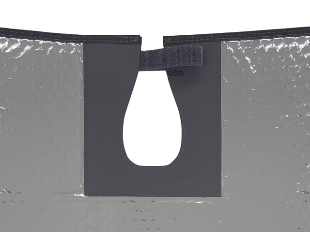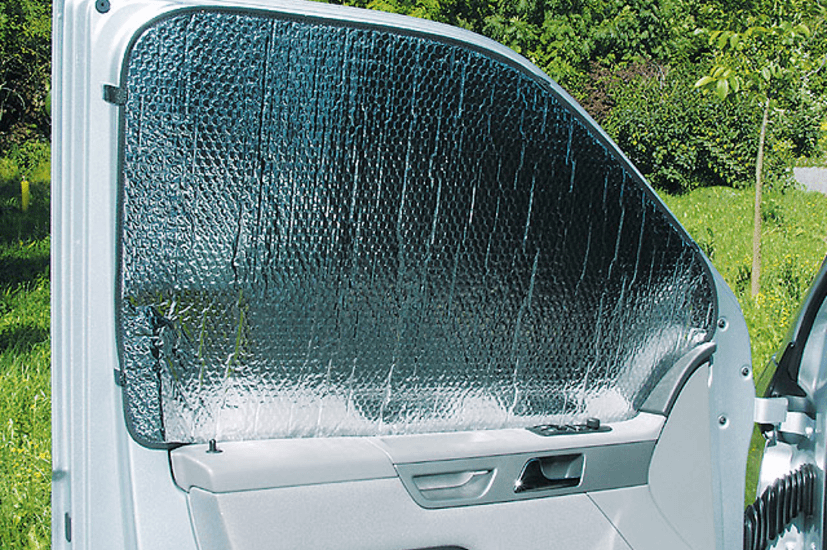 Les isolants des vitres latérales de la cabine conducteur s’encastrent également dans l’encadrement des vitres et sont fixés efficacement par des fixations velcro situées tout autour de la vitre. - Toute la surface de la vitre est toujours fermée sans œillets ni ponts thermiques.