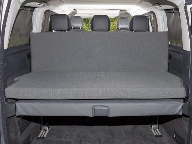 Le lit pliant se déploie par-dessus la banquette-couchette en place (3ème banquette) jusqu’au clapet du hayon et offre ainsi un excellent confort de repos – la partie inférieure de chaque partie est conçue de manière à rendre imperceptible les rebords de la 3ème banquette.
