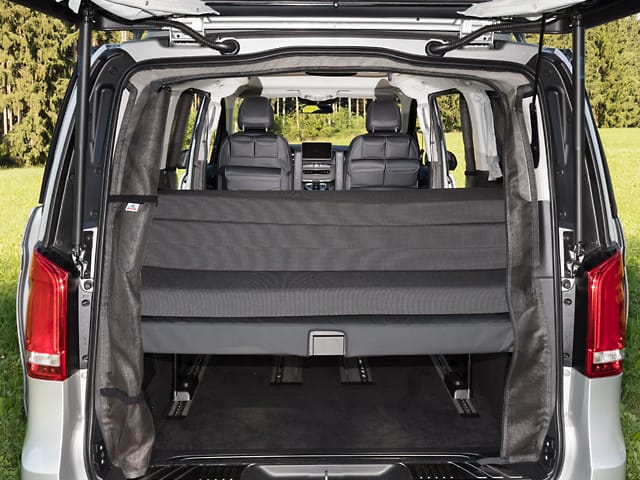 On peut déployer le lit pliant iXTEND et l’adosser au dossier de la 3ème banquette de la Mercedes-Benz Marco Polo HORIZON, de manière à créer une surface unie idéale pour le repos. Elle est également pratique soit pour entreposer les bagages dans le hayon, comme lit d’enfant facilement accessible ou encore comme grand espace de voyage pour un chien.