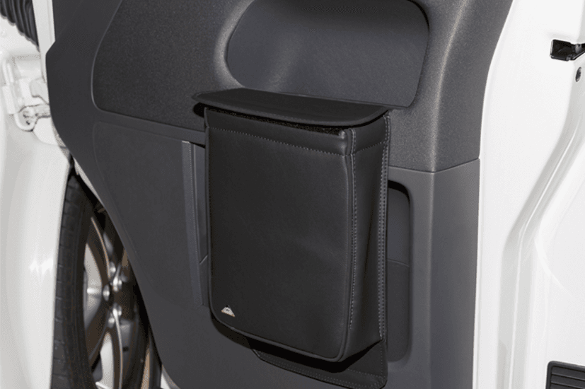 - Autre avantage : les objets dans le vide-poches sont mieux protégés lorsqu’on ouvre la portière. Le casier à bouteilles à gauche est toujours accessible, même avec la portière fermée. On met le rouleau de sacs poubelle dans la MULTIBOX et l’on tire le premier sac vers le haut. On replie le haut du sac poubelle par-dessus la courroie intérieure du pourtour de la poche et on le fixe avec les deux boutons pression.