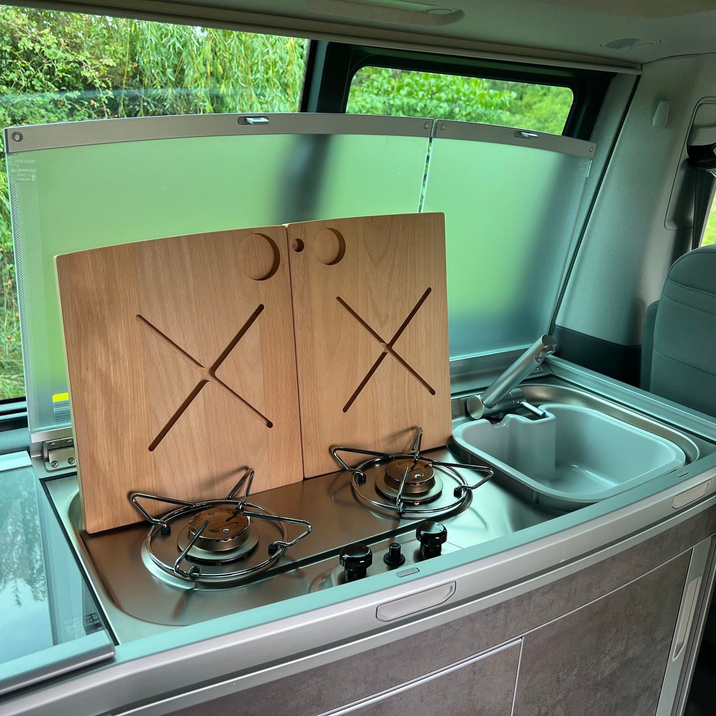 Ce set de 2 planches à découper en bois de hêtre massif s’adapte parfaitement sur les deux foyers de la cuisine d’origine de votre California. Conçu par VAN-ZUBEHÖR, il transforme l’ensemble de votre réchaud en surface de travail maximale.