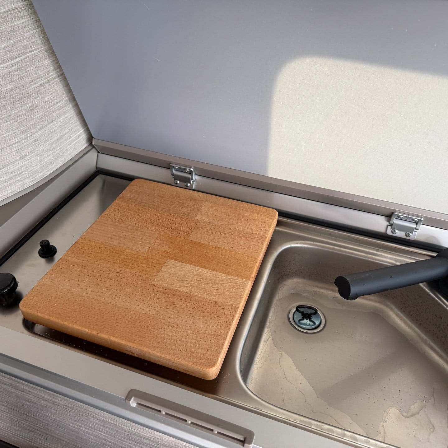 Cette planche à découper en bois de hêtre massif s’adapte parfaitement sur le réchaud de la cuisine d’origine de votre California T7. Conçue par VAN-ZUBEHÖR, elle transforme votre réchaud en surface de travail fonctionnelle.