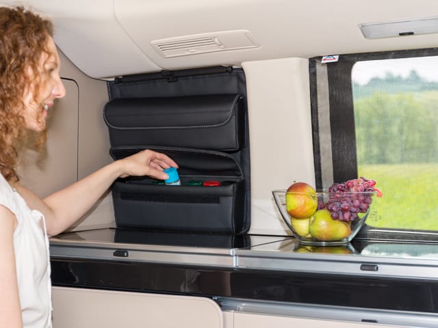 Deux poches de rangement transforment la petite fenêtre latérale gauche en rangement supplémentaire : Les 2 poches sont capitonnées anti-bruits, et l’intérieur de la poche du bas possède des boucles élastiques pour maintenir 6 flacons à épices (flacons à épices non livrés).
