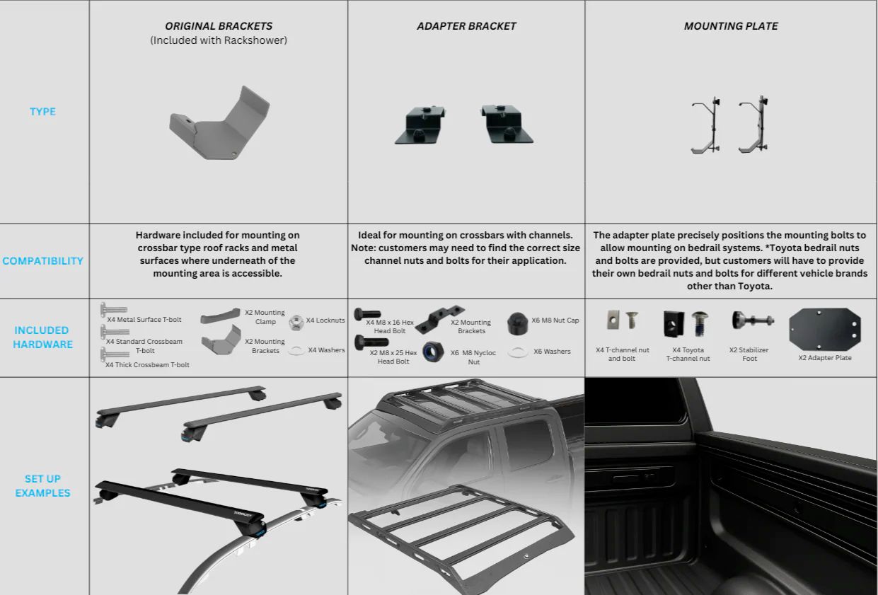 - ? Adapter Brackets (prix à venir) : Paire de supports additionnels pour montage sur système de rails spécifiques avec channels (Toyota, T-Channel). Inclus : 2 plaques d’adaptation, boulons spéciaux, pieds stabilisateurs.