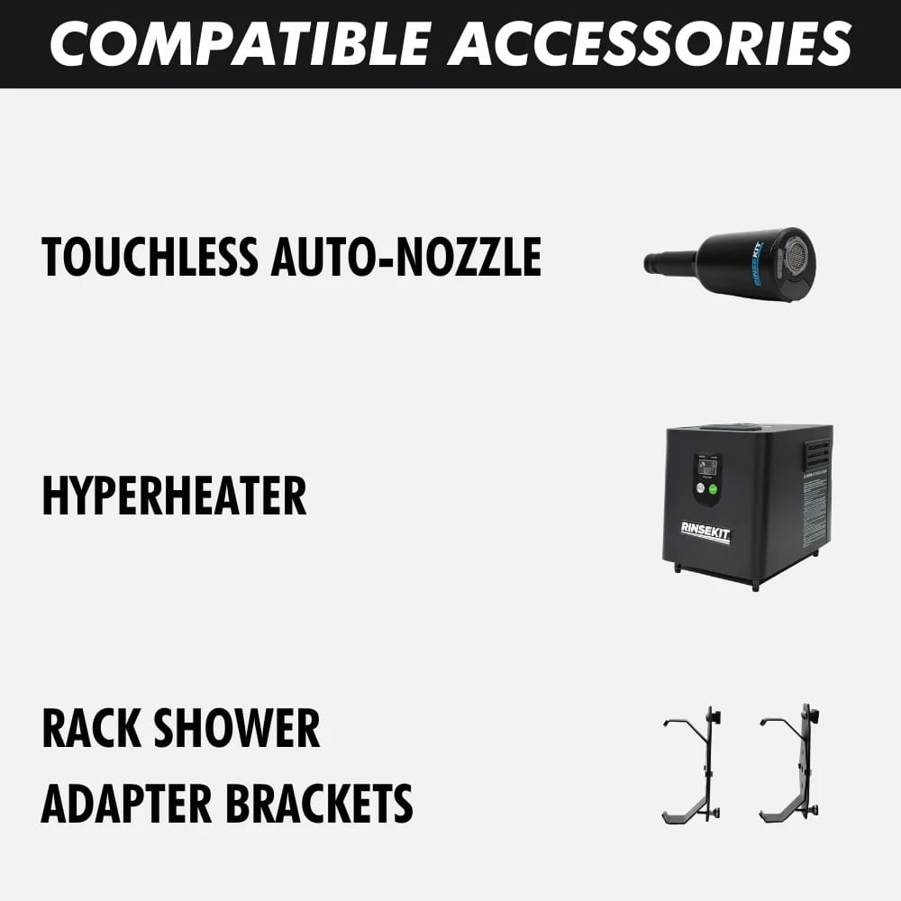 Option 1 : Remplis avec de l’eau chaude (depuis ton van si équipé). Option 2 : Ajoute un Hyper Heater 2.0 propane (eau jusqu’à 49°C en 30 secondes). Le Hyper Heater peut être fixé sur ton van à côté du Rack pour un système complet !