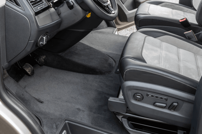 Tapis sur mesure, en velours, pour la cabine conducteur de tous les T6 Volkswagen avec conduite à gauche et 2 sièges individuels.