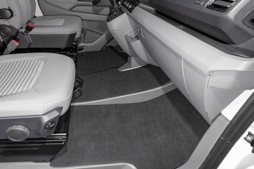 - Ref – 100708633 – Tout T6 Volkswagen avec 2 siĆØges individuels avants : Tapis en 1 piĆØce protĆ©geant lāensemble de la cabine conducteur + passage de roue gauche + passage entre les 2 siĆØges.