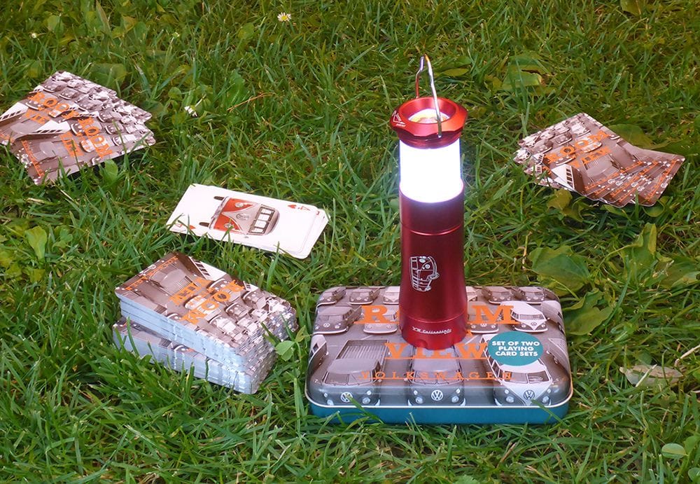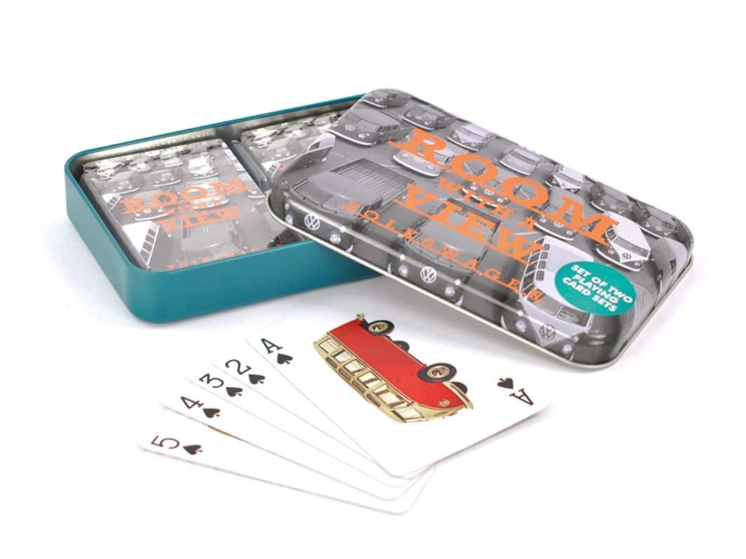 • Cartes à jouer serties de motifs rétro Combi dans une boîte en métal pratique pour emporter ou pour une soirée de jeu amusante à la maison.